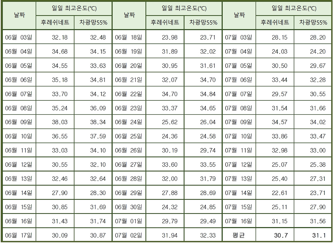 고온기 "후레쉬네트" 및 "흑색 차광망55%" 하우스 일일 최고 온도 비교 조사 (2020년 6월~7월)