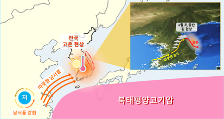▍ 우리나라 상하층에 더운 공기 자리하고 잦은 남서풍과 강한 햇빛 때문