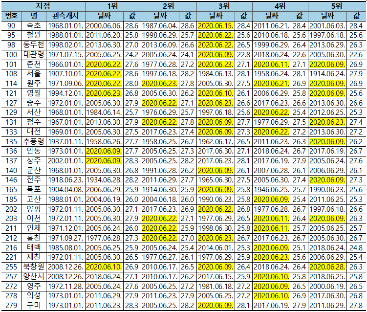 □ 2020년 6월, 일 최고기온 상위 순위 (단위 : ℃)